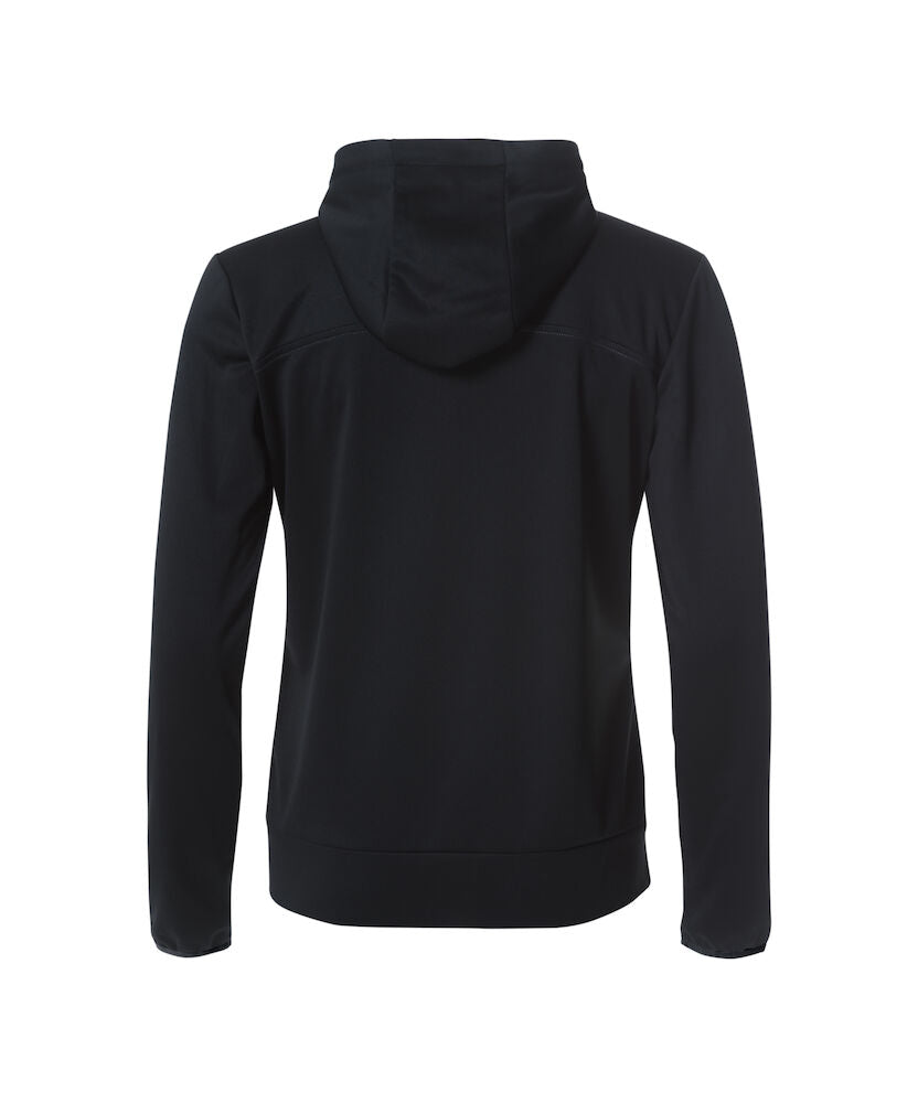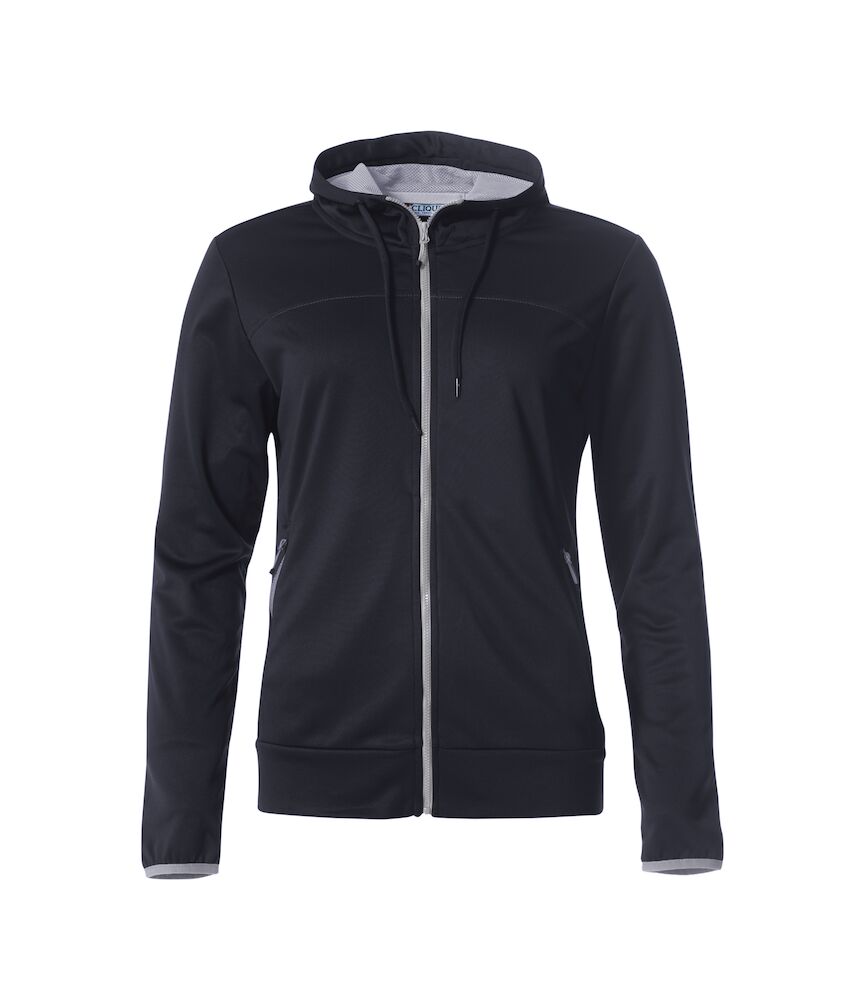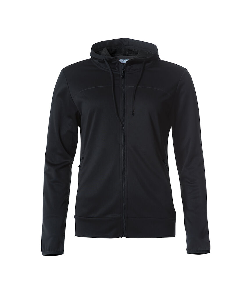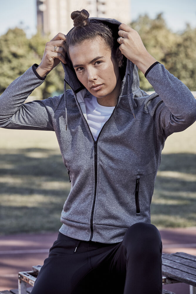 Women's sports sweatshirt with hood and divisible zip. Stretch technical fabric, soft and comfortable. Hood with mesh lining and drawstrings. Elastic profile cuffs. Side pockets with zip. Internal pockets with earphone hole.