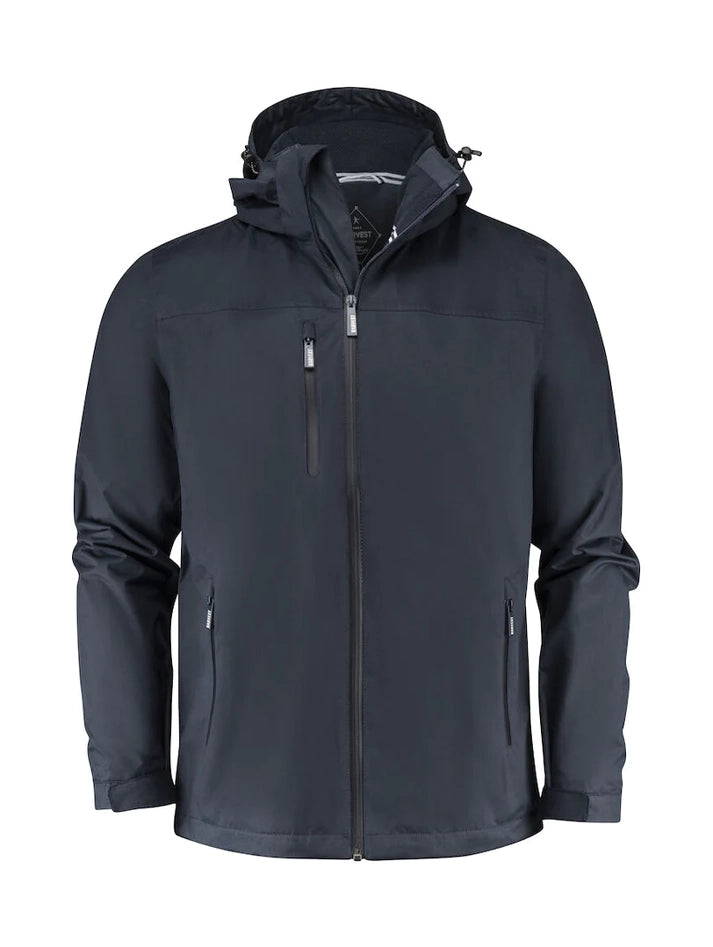 Technical women's fleece-lined jacket with detachable hood. Waterproof zips and taped seams. Three external pockets with zip and internal pocket with earphone slot. Adjustable hood and bottom with drawstring. Opening on the back and on the hood to facilitate printing and embroidery.