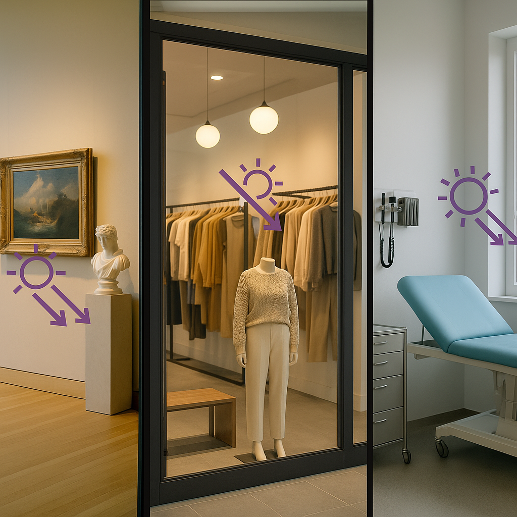 I raggi UV danneggiano pelle, tessuti, mobili, parquet e prodotti in esposizione. Le nostre pellicole filtrano in modo invisibile la radiazione nociva.
