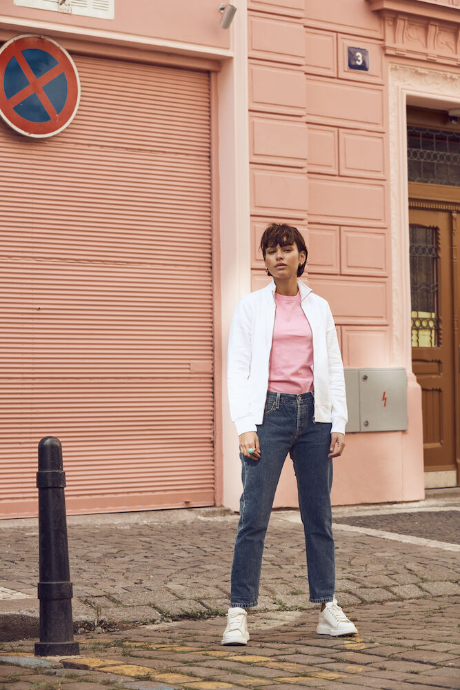 Felpa cardigan con cerniera divisibile. Tessuto stabilizzato. Costine 2/2 elasticizzate. Cuciture ribattute flatlock. Nastrino collo. Due tasche laterali con zip e due interne con asola per auricolari.