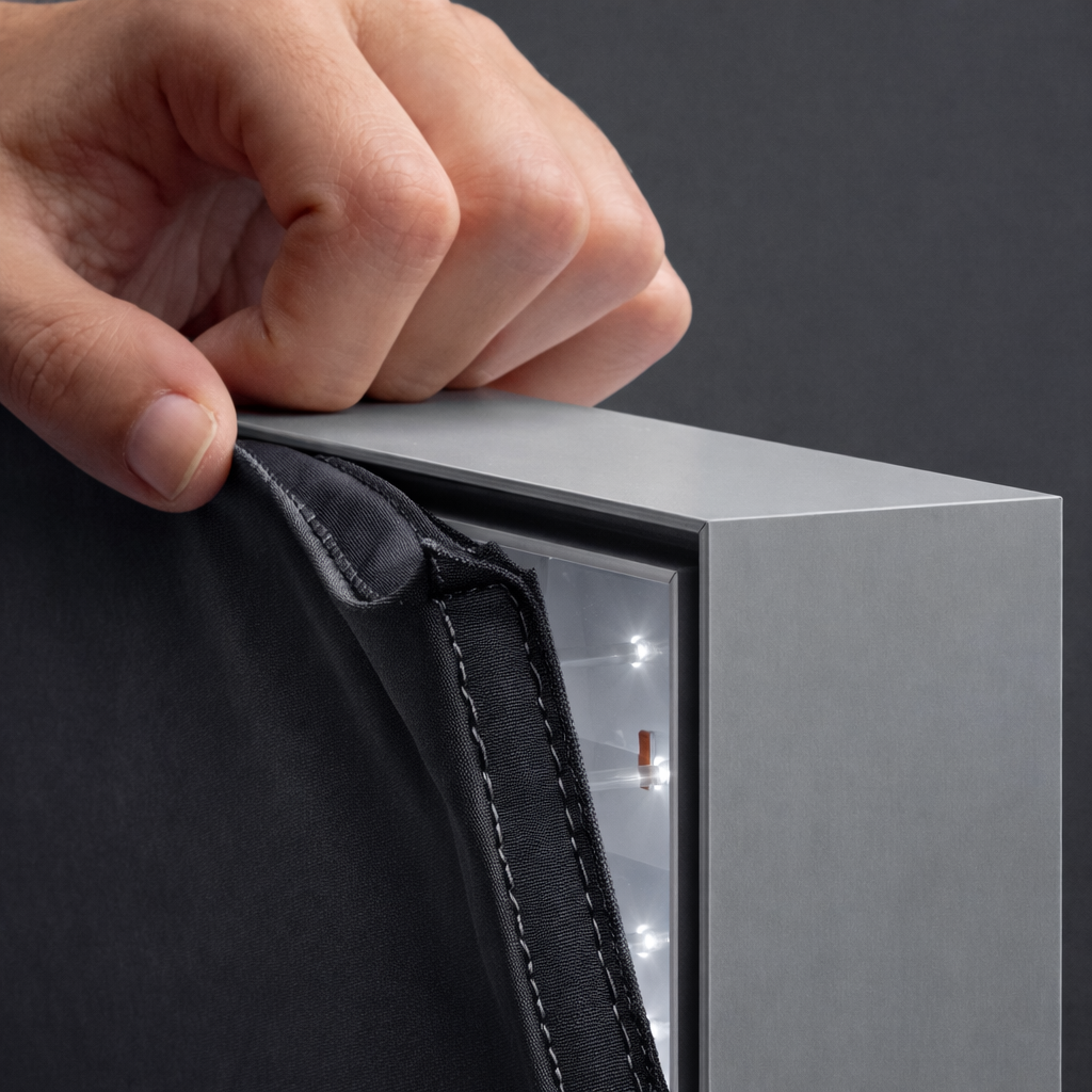 Il tessuto in tensione garantisce una superficie perfettamente liscia e un’illuminazione omogenea su tutta l’area.