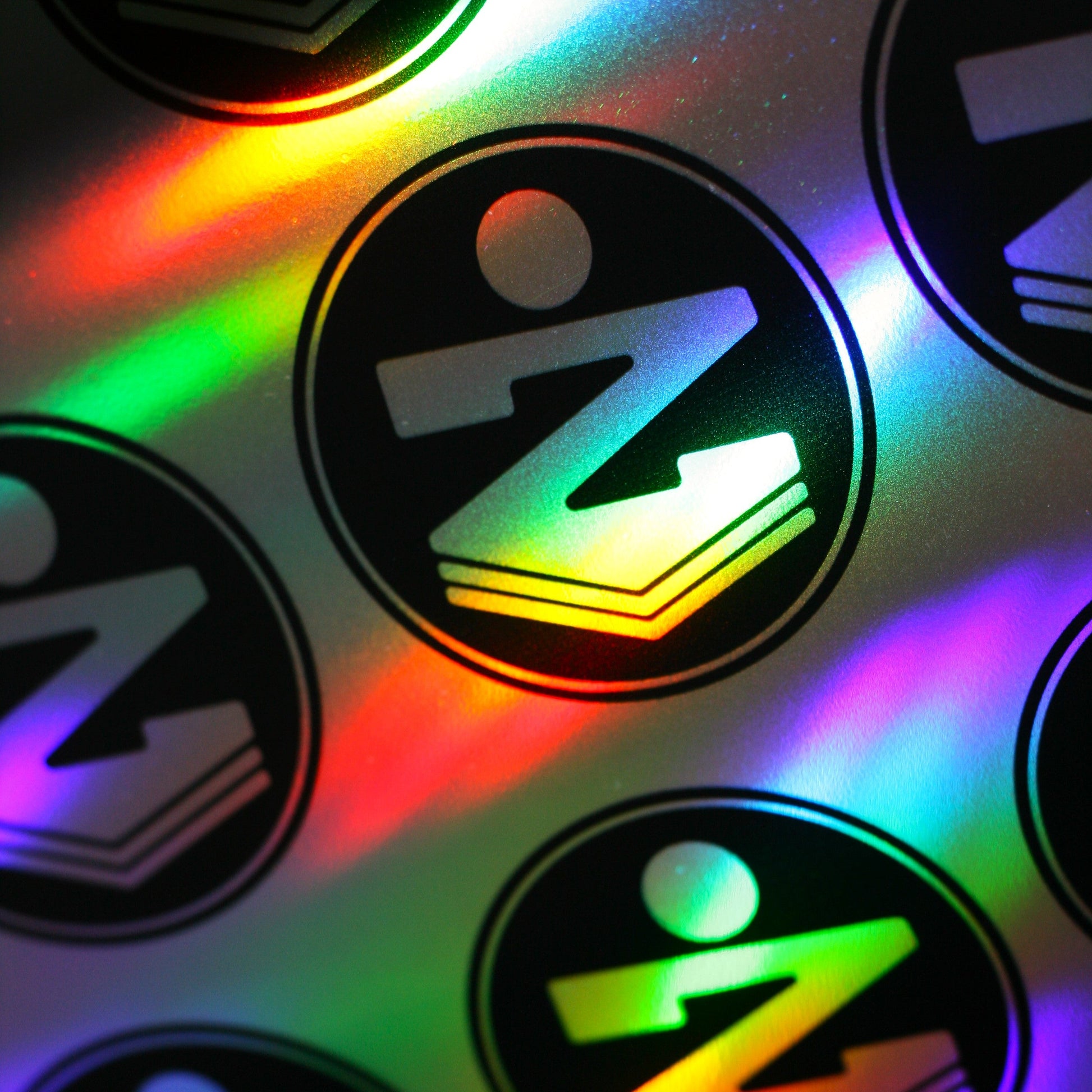 La superficie olografica riflette la luce creando colori iridescenti, mentre la grafica viene stampata in nero per garantire massimo contrasto, eleganza e leggibilità.